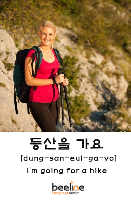 Take a look at today’s Korean sentence: “Dung sang eul ga yo”. ‘Dung sang’ means ‘hike’, ‘ga yo’ means ‘to go’ and ‘eul’ is the object marker. Through our Beeline Korean program, you’ll learn the basics on how to put Korean sentences together by using verbs such as ‘ga’, to go, adding ‘yo’ at the end of the sentence to turn it into the formal way of speaking. With this knowledge of Korean already at hand, you only need to learn your new word, ‘dung sang’ in order to speak a perfect Korean sentence.